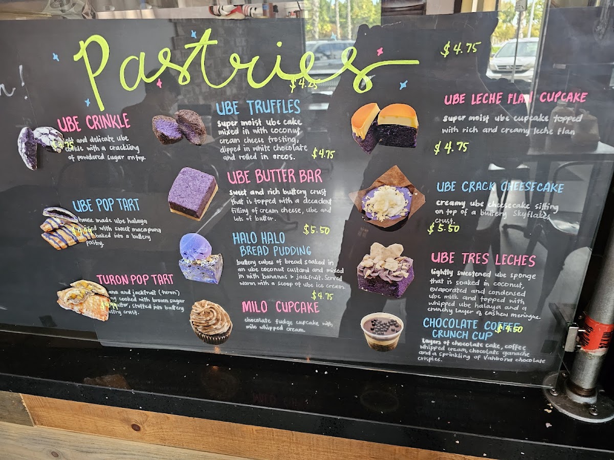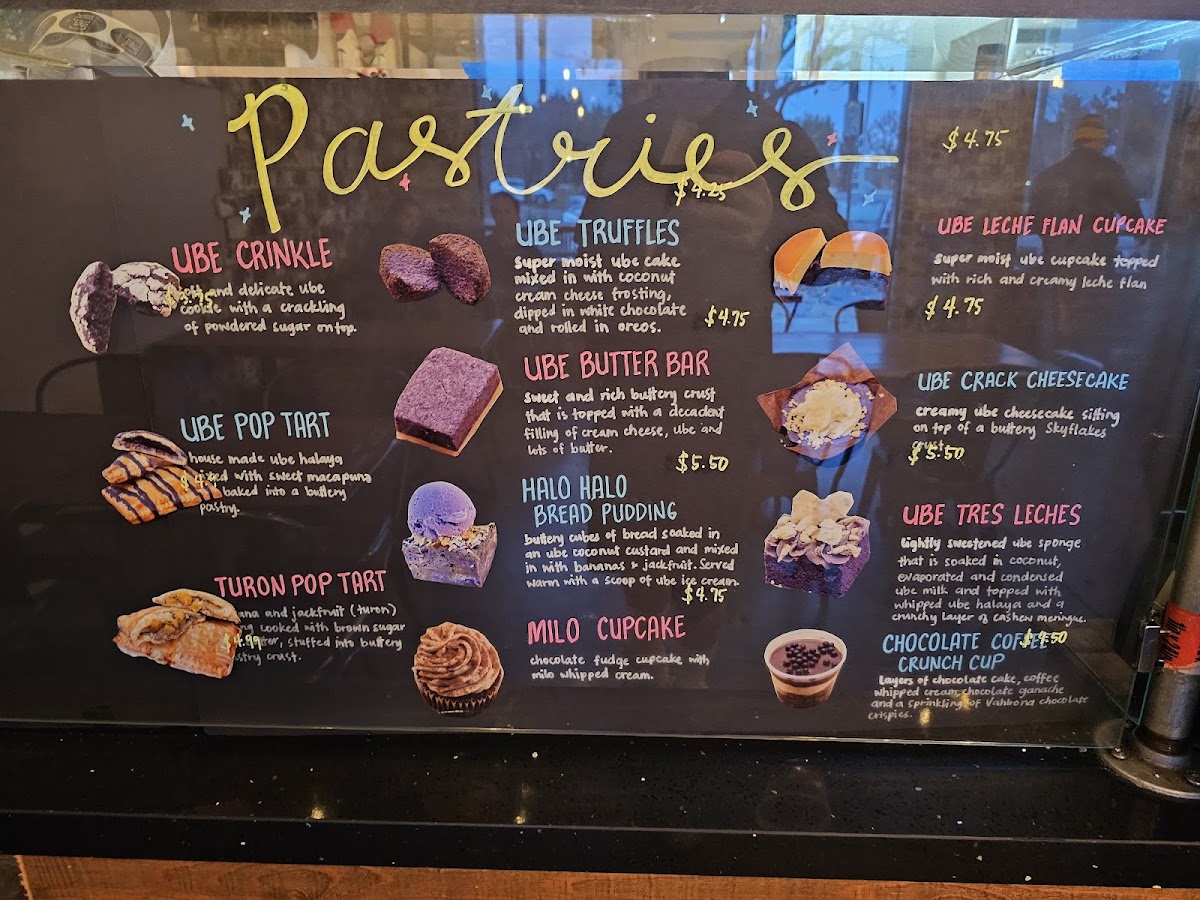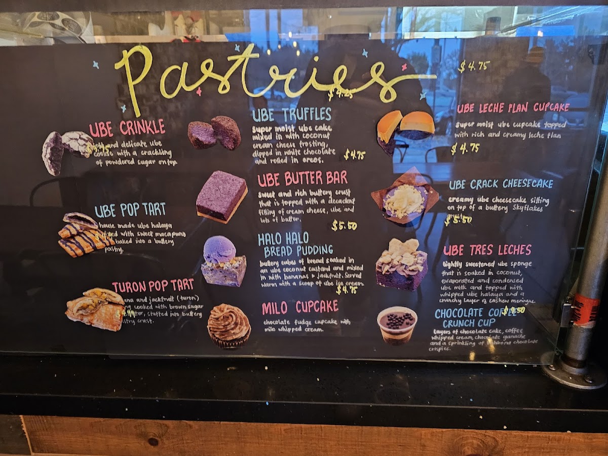 At Cafe 86 in Chula Vista, the menu offers a delightful fusion of Filipino-inspired desserts, drinks, and savory options. Starting with the Holiday Specials, they offer a unique Bibingka (a Filipino rice cake) available for pre-order only, with pickup dates from 12/22 to 12/24. For those with a sweet tooth, the Pastries section features several Combo Packs, including the Combo Pack #1 Truffles, Combo Pack #2 Ube Leche Flan, Combo Pack #3 Cheesecake, Combo Pack #4 Crinkles, and the Combo Pack #5 Ube Sampler Pack. These combo packs bring together the best of their Filipino-inspired treats, perfect for sharing or indulging in your favorites. The Baked Goods also offer an array of delicious options such as the 1 Dozen Ube Leche Flan Cupcakes, 1 Dozen Ube Truffles, Halo Halo Bread Pudding, Milo Cupcake, and the unique Turon Pop Tart.