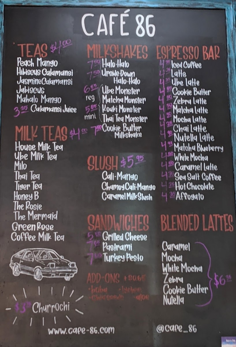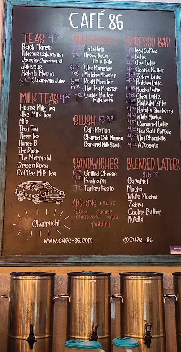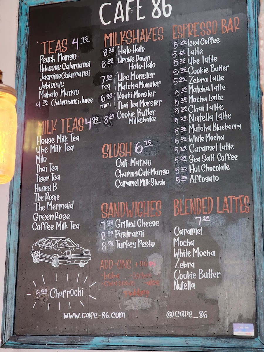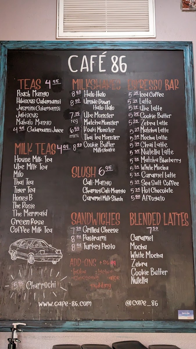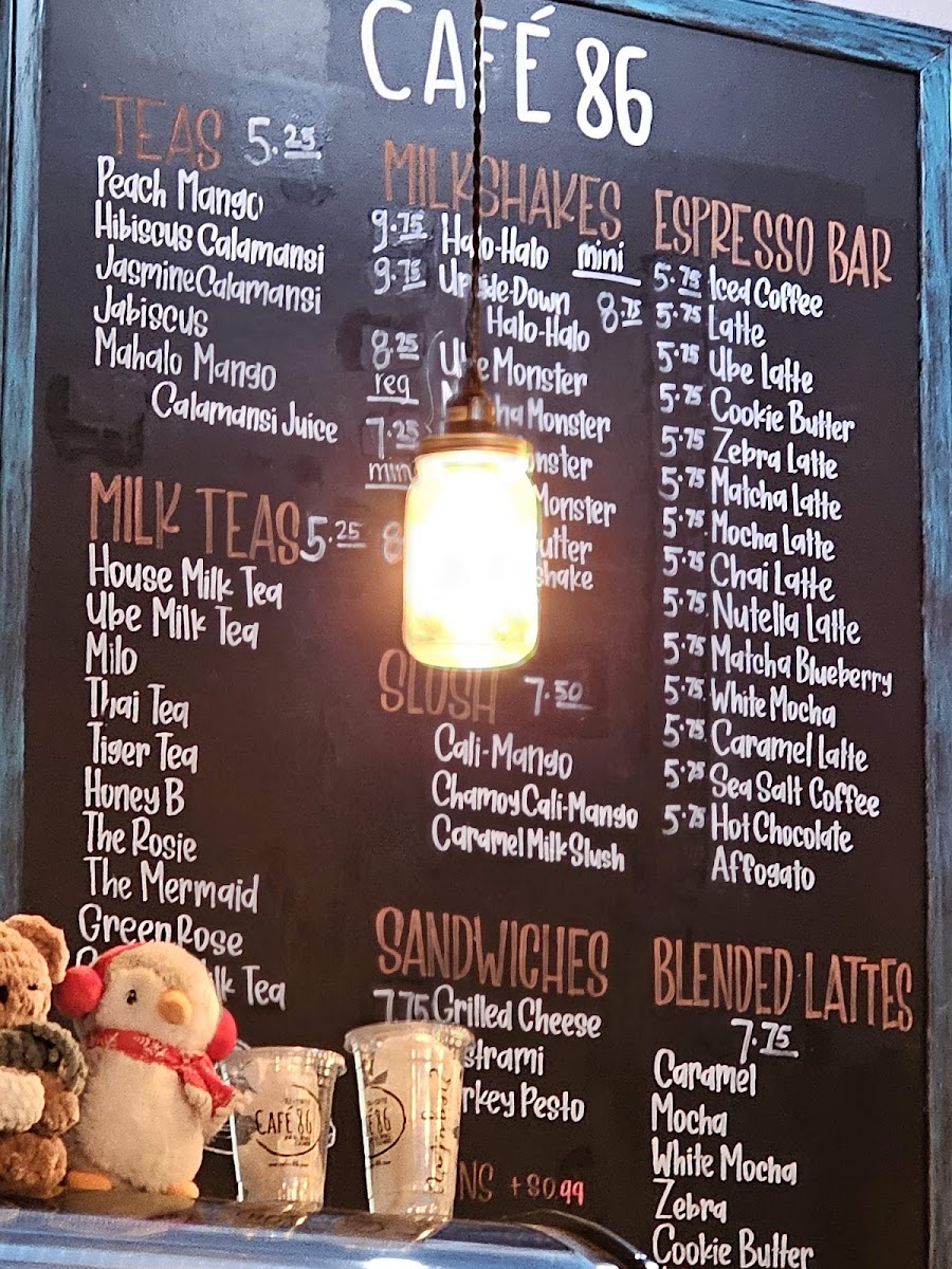 Overall, Cafe 86 offers an extensive menu with something for everyone-whether you're in the mood for a sweet treat, a refreshing drink, or a hearty sandwich. Each item, from the savory to the sweet, is thoughtfully prepared and offers a delicious taste of Filipino-inspired flavors.